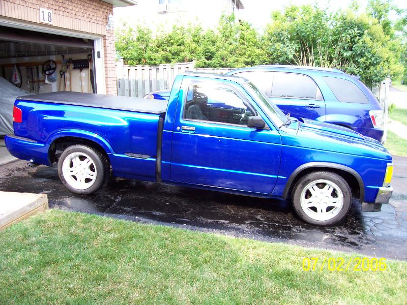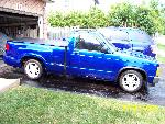 2001 stepside box modified to match the body lines of the cab, new cab, full body job. bright blue paint, striped of all mouldings, returned most of exterior to stock after I bought it, vent visors, small Blazer mirrors, fibreglass cowlinduction hood (non-functional), new chrome grille and bumper