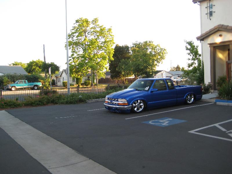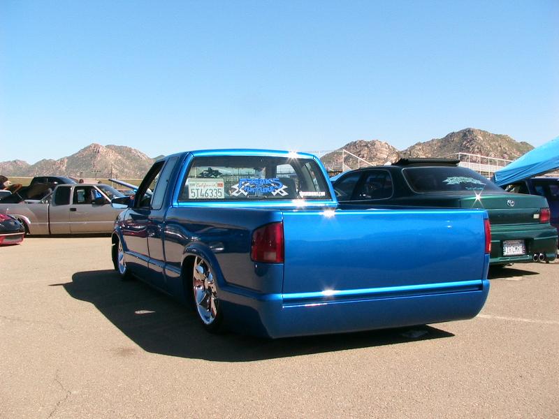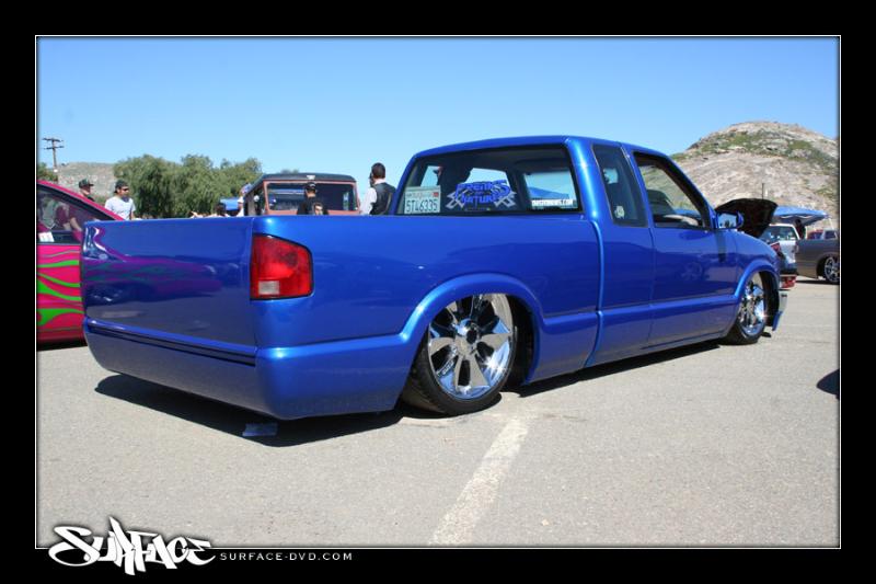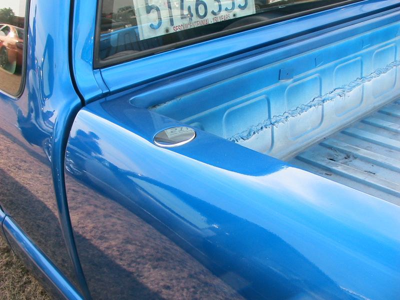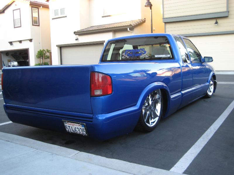 Shaved:---hood squirters, door handles, tailgate handle, molded Sir Michaels roll pan, bedrail corners, rocker seam, 3rd brake light, gas door, antenna. motorcycle gas filler in the bed rail. Raised bed floor 5" updated front bumper and valence. Subaru WRX blue paint, only the firewall was left OEM white. Everything done by me.