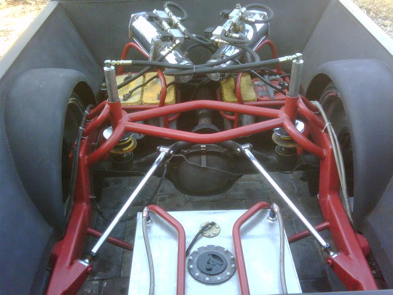 Stock floor body dropped, full new frame from firewall back, upper n lower a-arms, tubular rear setup, 4 link, 2 pump pro hopper setup with accumulators