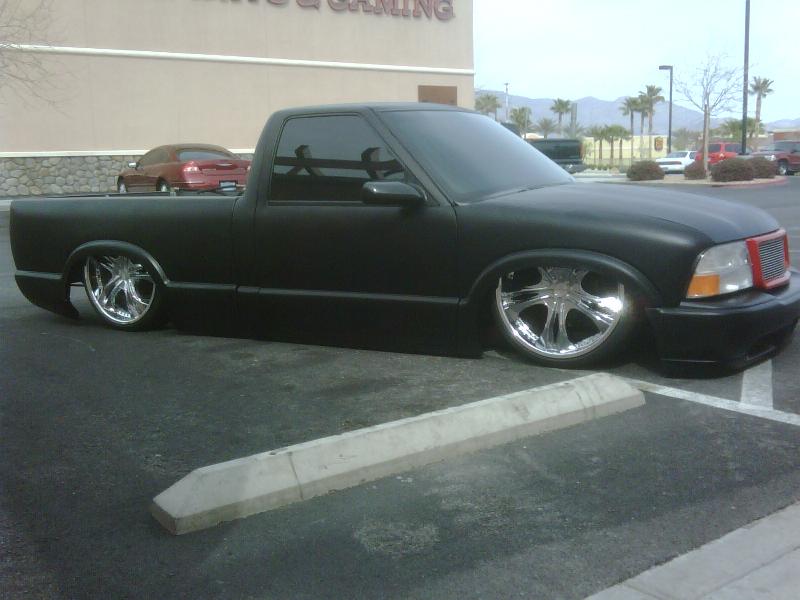 fully shaved, 2001 GMC sonoma front clip with billet grill, HID lights, fully shaved rear end with LED strip. full sheet metaled bed floor. Flat black for now