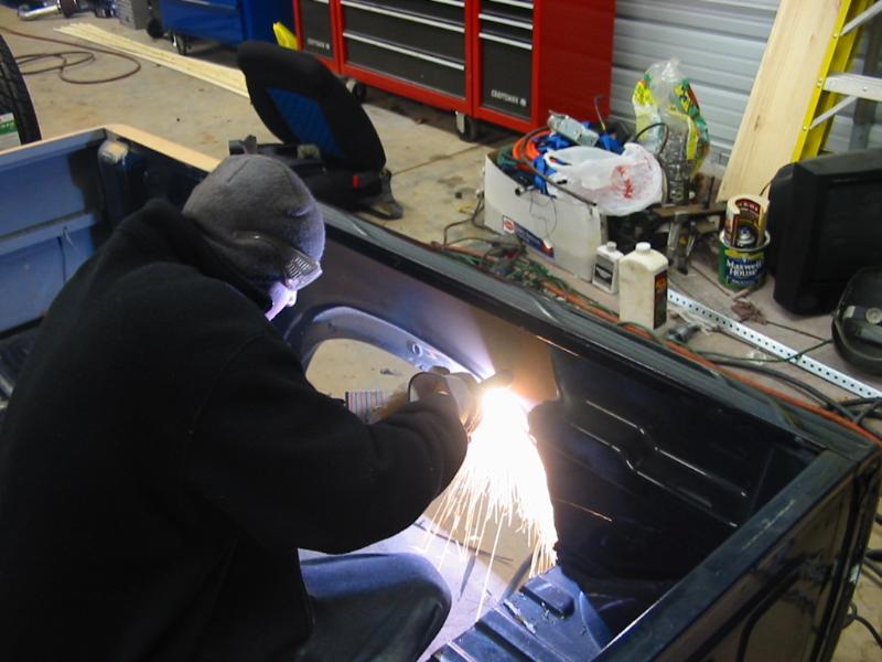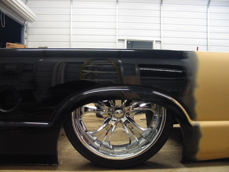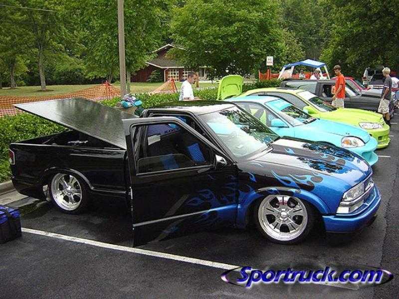 Shaved doors,antenna, hood pissers, full skin in back w/ 2 14" LED lights. Painted black w/ corvette blue flames and silver highlights.Shaved gas door and 3rd brake light