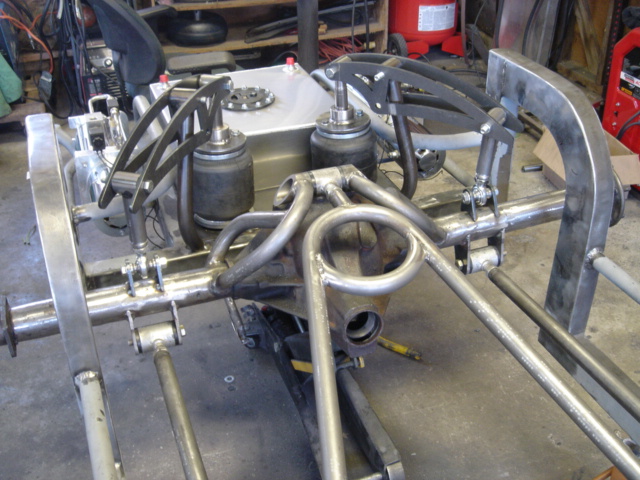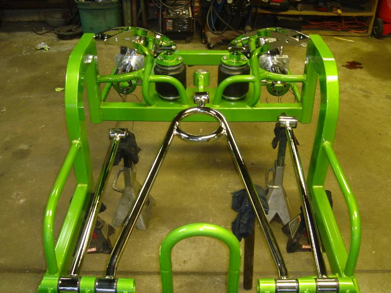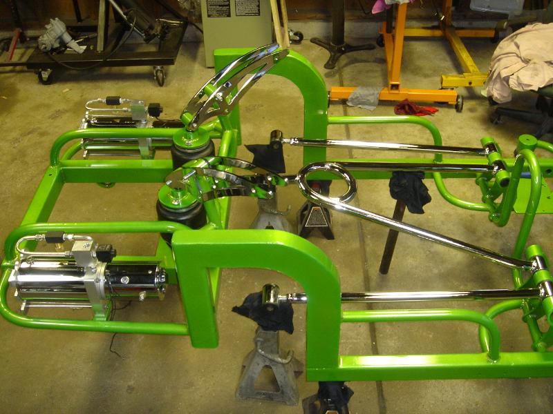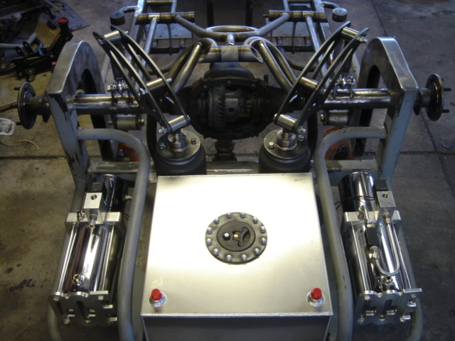 2 pump Hydro setup, 2 dumps. Hydro/air setup at all 4 corners. The air bags will be filled at a set PSI, which will allow for an adjustable spring rate, so i can adjust it to hard or soft depending on what kind of ride i want that day. The rear is in a cantilever form, with the cylinders flipped upside down..... Control arms by barelylegalfabrication.com