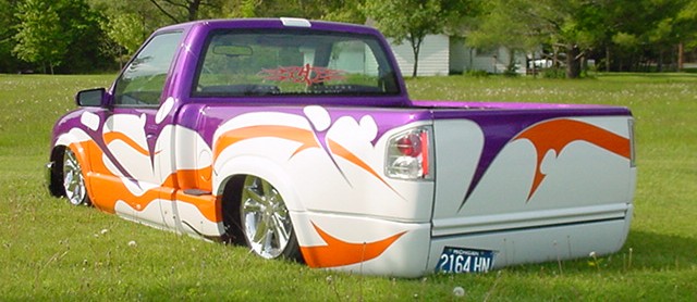 Shaved door handles, shaved mirrors, shaved 3rd brake light, shave taillights, shaved tailgate handle, shaved antenna, god rid of the step shaver kit, and am puttin the stock stepsides back on, i seem to like the look of them better, espically when there squashed on the ground. Finished the inside of the bed, sprayed a Rhino bed liner on it, hooked everything up and plumbed the juice, everything works niceley. Haveing battery problems tho, hopefully will be fixed soon. Waiting on sonoma front end parts, then it will hit the streets.