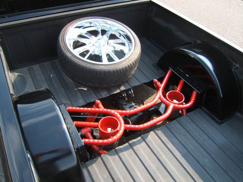 Modified stock control arms, 2b6 bags front, Sleeves rear, Custom front shock mounts for lock to lock steering, Wishbone 3-link out back, custom bridge work with polished rivets, Viair comps, 5 gallon tank, Easy St Digital management system, smc valves. Wheel tubs front and rear, Still has A/c. www.crazytalkcustoms.com