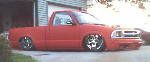 4.3 V6 Vortec TBI (now blown up). Shaved heads, bored over 30thousandths, ported and polished, with larger injectors. 8.5mm Plug wires, Boss Platnuim 4 Prong Plugs. Electric fan. 2 1/2inch exhaust pipe ran to a 3Aracing dual outlet polished muffler. Automatic transmission rebuilt with stall and shift kit. Painted acc. Aegean Blue and Pure White. Had to remove heat, air condition, ABS system, wiper motor, cruise control, belt driven fan, and rerun all wires for the body drop to snugly tuck the 20''s in the front. 4.3''s are fun. Droppin in a fully built 350 LT1 (or LS1)Corvette engine, equipped with twin turbo. And a full corvette driveline with disc brake rear end.