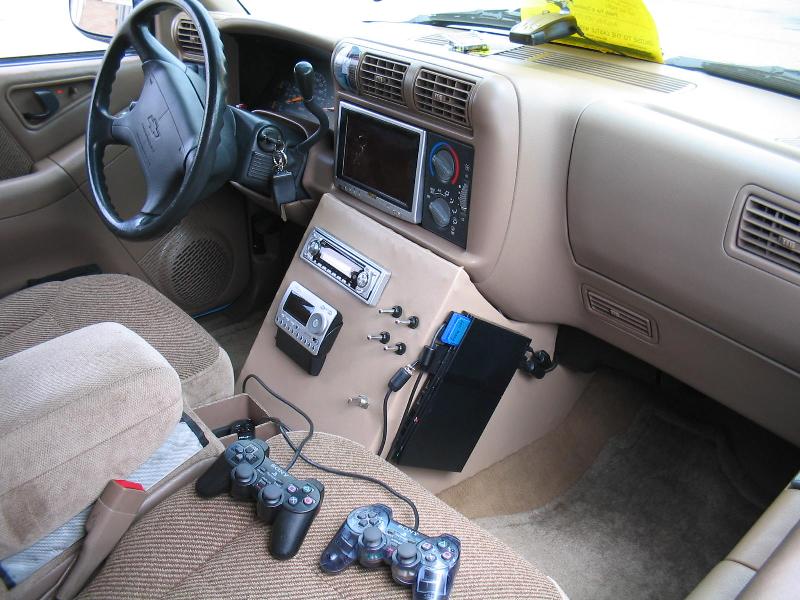 7.5" in-dash monitor, Custom console with JVC head unit, XM SkyFi, PS2 Mini, and neon switches.
