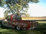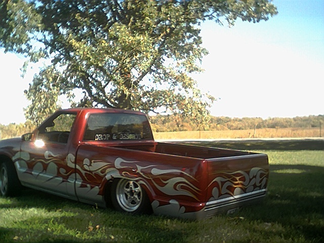 this winter full taigate skin with flames taillights shave mirrors ,3rd brake light,hood squirters and maybe trailblazer front. Some color primer with scalops or flames. Fiberglass center console with 2 10's and tweed. Update all air ride to everything 1/2
