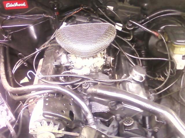 327 V8, Edelbrock 4bbl carb, Edelbrock air cleaner, Chrome valve covers. True dual straight pipes. No cats. Thrush mufflers. Exits on both sides just after the rear wheels.