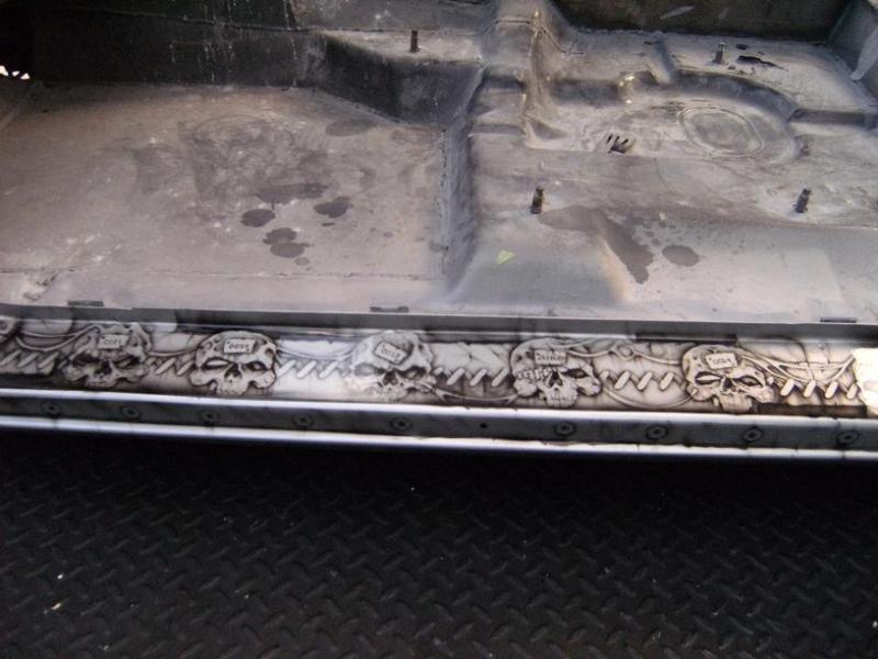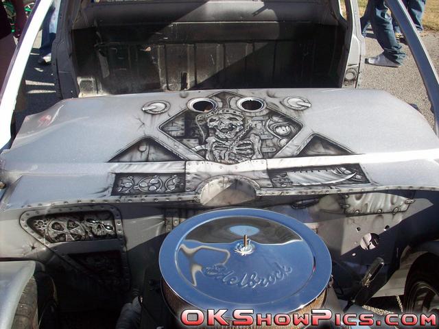 Sheetmetal bumper, s10/noma grille, tilt hood, stretched hood and fenders to windshield, grand prix doorhandles, tilt bed, sheetmetal bedfloor, Grant Kustoms skin, flushmount LEDs, shaved hood squirters, firewall,mirrors, 3rd brakelight, gas door, tailights, cab seams. Andromina silver with airbrush graphics by Jesse Marrow.