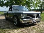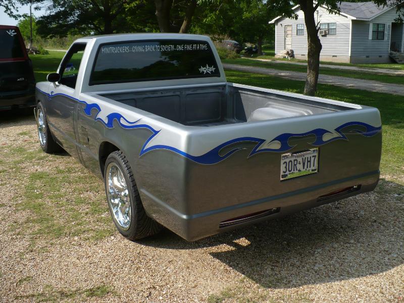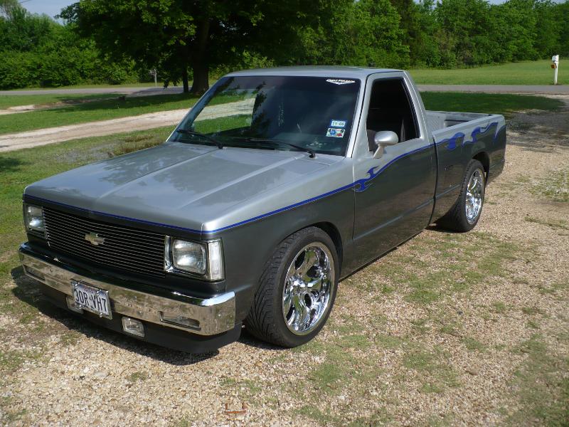 1992 Chevy s-10 pickup with a 1988 s-10 pickup front clip, after market chrome bumper, clear parking and marker lights (L.E.D), billet grill with billet s-10 emblem, lower valance after market fog lamps modified. Finders body line shaved/molded, windshield cowl and window squirts shaved/molded. After market modified shaved/molded mirrors replaced with 1968 Camaro mirrors, shaved/molded doors body line shaved/molded. Body lines shaved/molded, After market filler plates (replacing the factory tail lights), tail gate skin, roll pan, all shaved/molded into truck bed structure. License plate box shaved/molded into tailgate skin. In roll pan Cadillac tail light buckets and lights shaved/molded into truck bed structure. Lebraa vinyl bed cover Over all modified drop suspension springs and block-leaf spring with after market air shocks. 18 inch wheels chrome Panthers. Custom paint three tone light silver, dark gray, blue tribal flame.