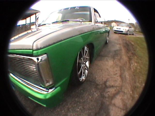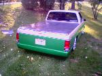 sold. shaved handles, antenna,emblems,tailgate, & front bumper, phantom grille, tailgate& rollpan molded to body, License plate box in center of tailgate skin, 3rd brake light above license plate, Honda del sol green & chrysler silver paint seporated by black tribal flames Clear corner & bumper lenses