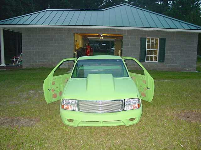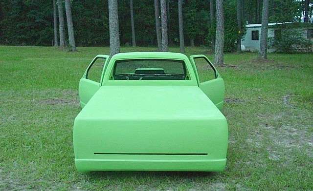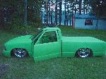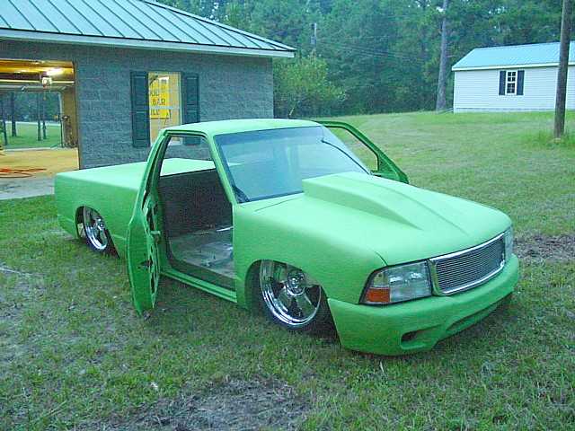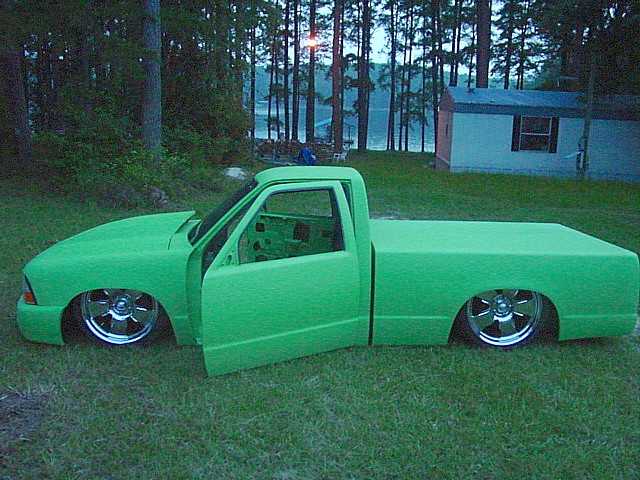 FULLY shaved, Welded up bed, Grafted 2002 GMC Sonoma front end with hand built 4" cowl induction hood, Bodydropped 3.5", Suicide doors, 4" LED smoothed into tailgate skin.