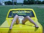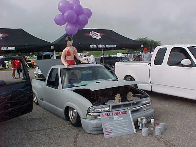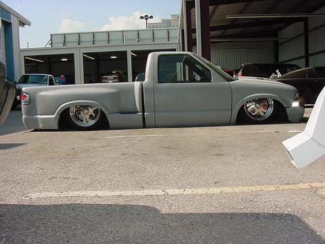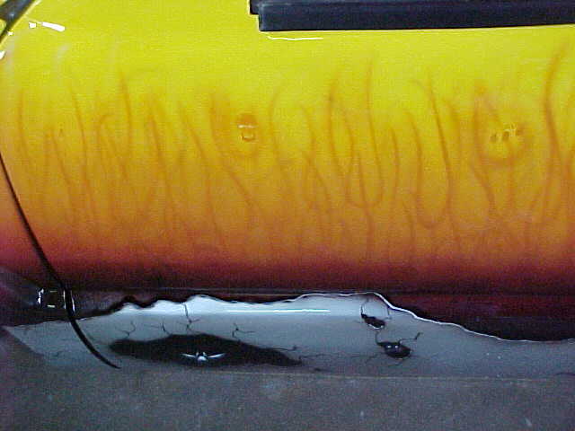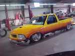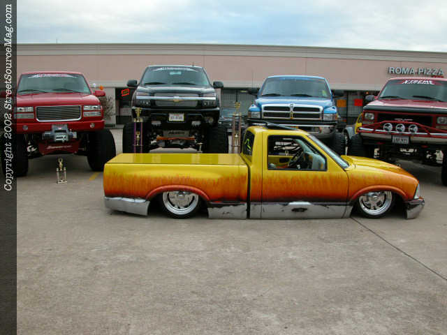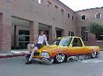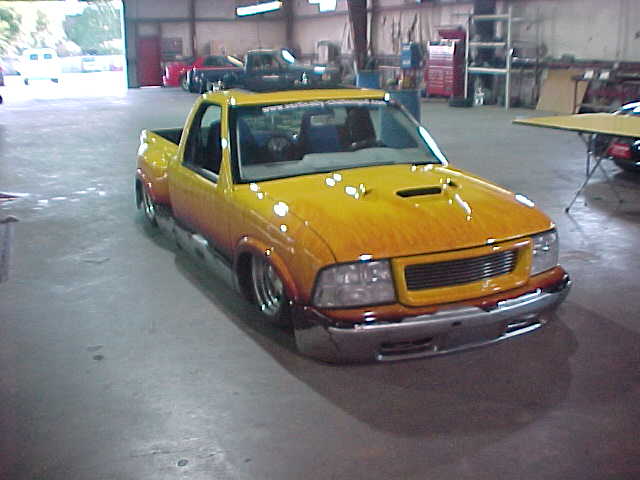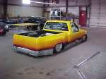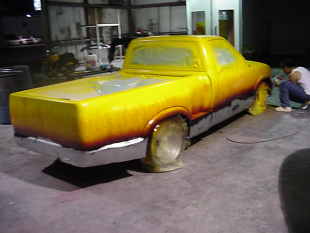 Shaved: door handles, tailgate, mirrors, squiters, gas door, wipers, antenna. 5 1/2 inch body drop to the doors , Yellow base , orange, red fire going up w/granite on bottum