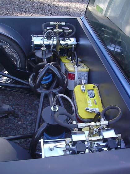 Pro Hopper 2-pump hydro system, 4 Optima Yellow-tops, 10 switch box. Hydro system uses part of the frame to transfer hydro fluid to the cylinders. Front ; Stock suspension arms and steering. 2" dropped spindles. QA1 aluminum shocks. Rear: NDC 4-link suspension, NDC Canti-lever shock mounts, QA1 aluminum shocks. Frame; NDC Firewall-back Jig Fabricated Frame.