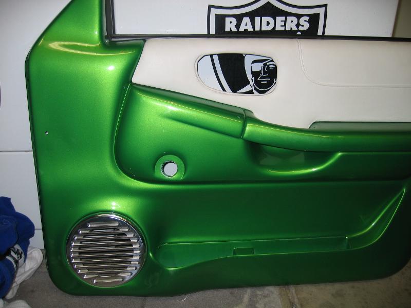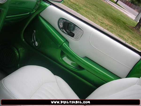 FULLY PAINTED DASH WITH MOLDED KP GUAGES. BILLET DOOR BEZALS, BILLET OH SH*T HANDLE, BILLET DASH VENT, BILLET SPEAKER GRILLS AND BILLET (BRASS KNUCKLE) SHIFTER. PAINTED DOOR PANELS AND DYNAMAT THROUGH OUT THE CAB. MORE BILLET PIECES TO COME. WHITE CARPET & KRIST KUSTOMS STREAMLINE STEATS TO BE WRAPPED IN WHITE LEATHER.