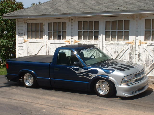 SOLD stock indigo with dupont hot hues pearl silver flames, truck covered in house of color chrome metal flake, stillen bumper cover, m3 mirrors, handles and wiper cowl painted to match.