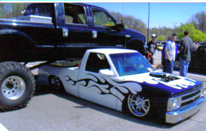 Everything shaved except taillights, 5 inch body drop, phantom billet grille, painted white with some really nasty looking flames.
