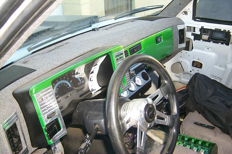 98 mustang bucket seats, billet spider web rear view mirror, polished shift column, custom skull shift knob, colorado customs spider web steering wheel, custom tweed flame headliner, chrome window cranks, 20% window tint, tweed a-pillars, tweed dash, billet flame skull pedals, custom gauge mount, green 10 toggle switch box, 1 single needle air guage and 2 duals, alarm, billet dash accents, chrome fire extinguisher, painted glove box door, painted gauge surround, tweeded and smoothed/flamed door panels, billet lokar oval door handles, tweed shift boot
