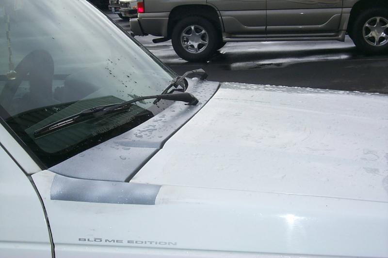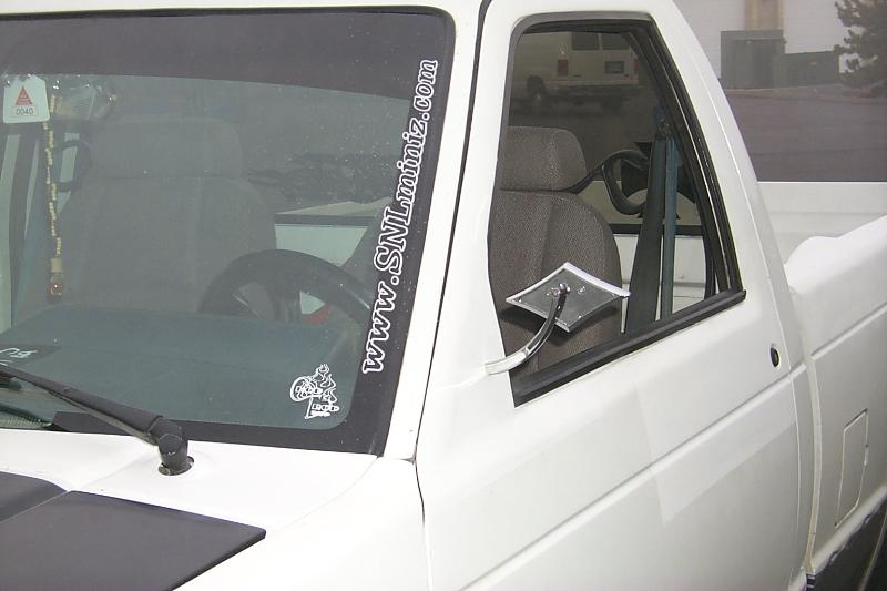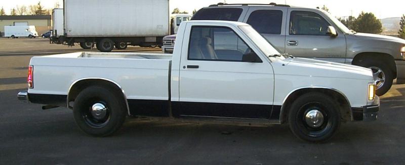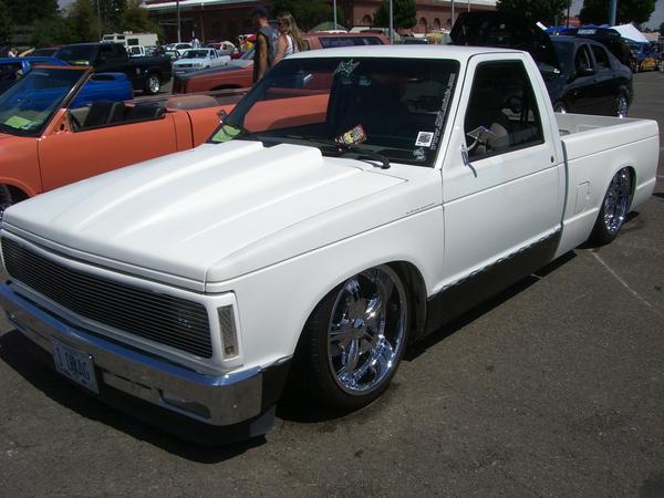 white with black rocker panels, roll pan, shaved wiper cowl, shaved door handles, shaved antenna hole, phantom grill, chrome smoothie front bumper, euro bumper and corner marker lights, cowl hood, valance, chrome diamond mirrors, custom mirror filler panels made out of bug sheet metal, shaved molding, bed cut out for c notch, cab notched for driveshaft clearance, custom flame graphics, diamond projector headlights, rear tubs, shaved squirters, shaved tailgate, shaved tail lights, 10" led strips frenched into the roll pan, tailgate handle flip kit, chrome mazda b2200 tailgate handle, billet rear license plate frame, personalize plates "I DRAG", 3" body drop, shaved firewall, suicide doors, sheet metal bed, shaved gas door, flush mount pop up gas cap