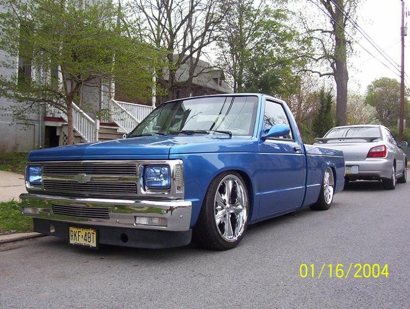 bright blue paintjob i jus got done doin shaved tailgate wit recessed license plate, shaved antenna. rollpan, mirrors, billet grille, headlights