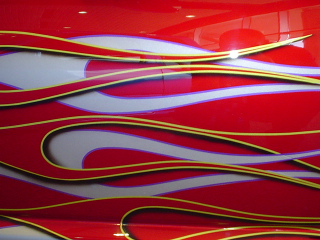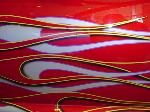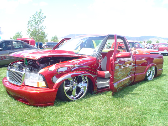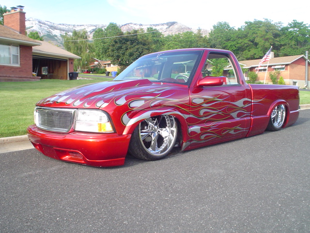 Shaved everything, Suicide doors, sheet metal bed, caddy tails, hand fabricated 2" cowl hood, 98 Sonoma front end swap R-M Carrizma Candy Apple Red paint with lots of flames.