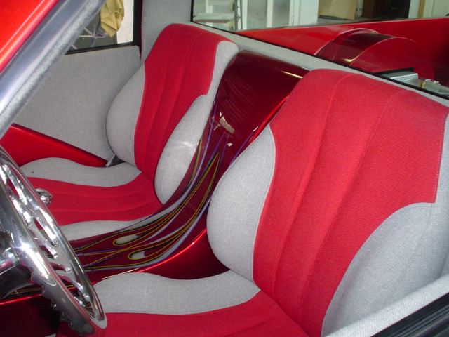One off interior, sheet metal dash and console painted to match the exterior, Flaming river tilt column, colorado customs steering wheel, tweed floor, seats and plastic parts and lots of billet.