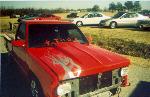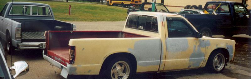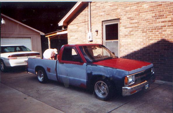 shaved door handles, tailgate handle, vents in the cowl panel,gas tank door,shaved body line in the cab and the body,roll pan welded in with the license plate box on the left side,a custom box with 95 s-10 gas tank door built in the bed for the gas tank,viper red paint from chrysler,full crome from bumper,cowl hood 2 3/4 inch, flush mount bed lid that opens to the right.