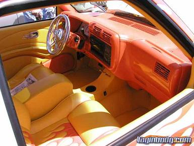 Totally custom interior,layed out in yellow and orange. FLAME MIRROR FLAME HANDLES