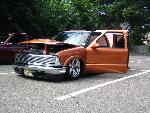 shaved door handles, antenna, taillights, hood squirters and rear bumper. 95 front end conversion w/ chrome phantom grille and chrome 98+ bumper. 35x35 sliding ragtop. full tailgarte skin, cadillac tails. billet 3rd brakelight. cirvinis hood, gaylords tonneau. painted landrover burnt orange pearl.