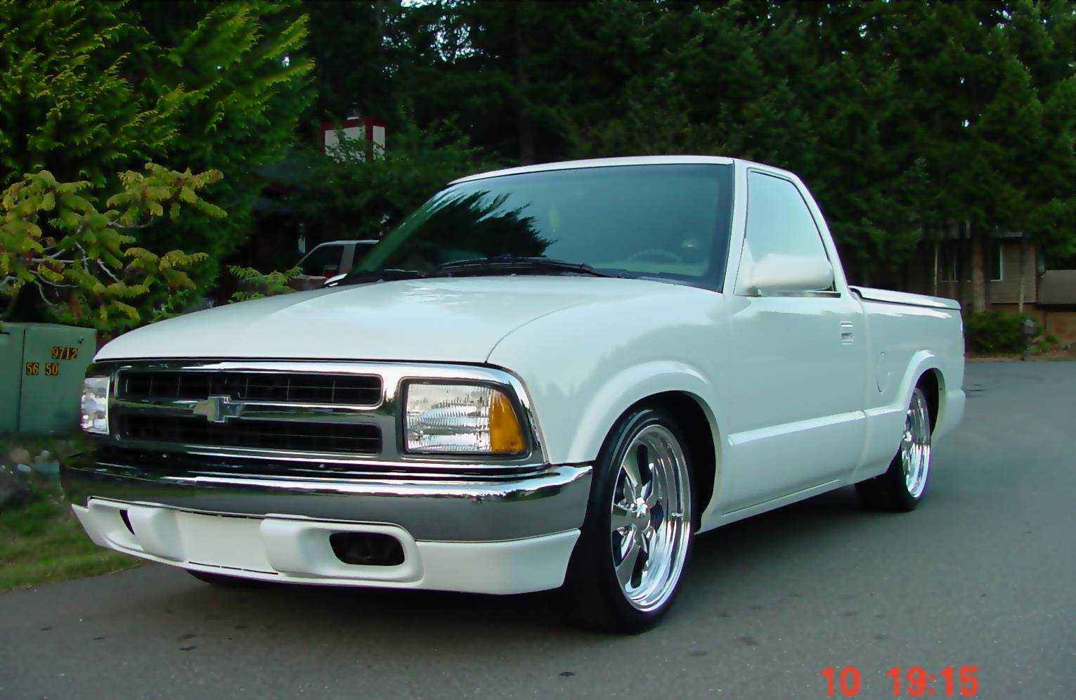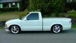 97 blazer composite headlights and chrome grille, billet emblem, 2000 s-10 chrome front bumper and painted airdamn, relocated stock bumper turn signals and mounted on the front framerails, PIAA foglights, sshaved antenna and tailgate with relocator kit, Street Scene mirrors, altezzas (i know they are played out, but clears are just asking for trouble), Stockland tonneau cover w/carpet kit in bed, rollpan