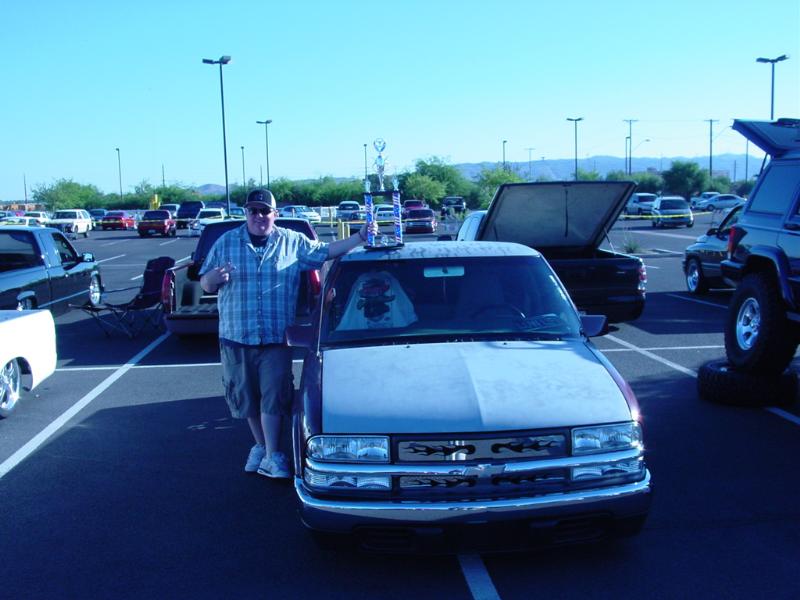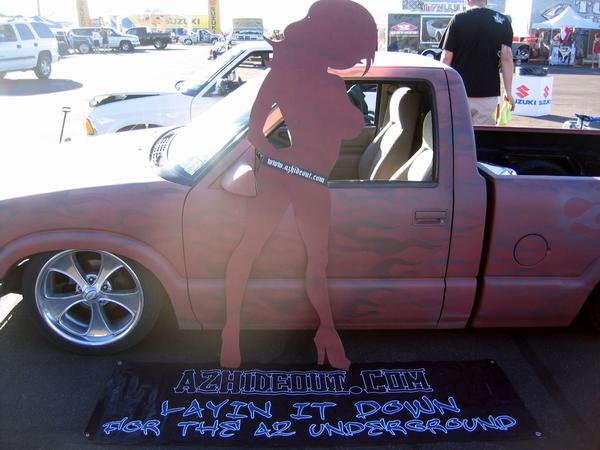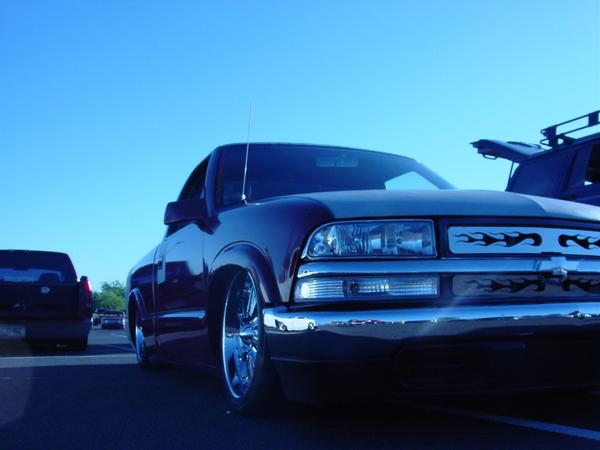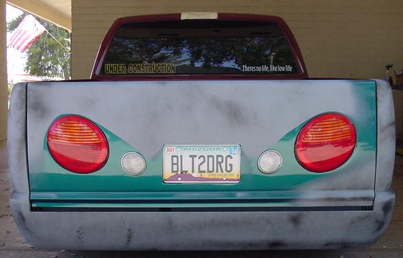 Rockin flamed Primer, 98+ front end, MIC Fast Flames, TYC clear headlights and turn signals, Billet bowtie, relocated tailgate handle, Molded Steel FBI rollpan, shaved tails, 99 VW beetle lights, shaved 3rd brake light, Shaved Antenna & shaved bed seams.