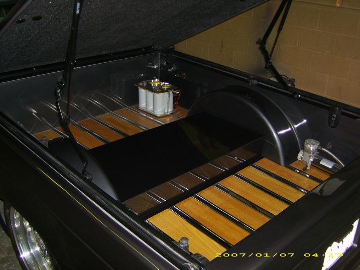 Stock gas door moved inside the bed, sheet metal'd bed walls and oak plank bed floor. 92 gmc jimmy grille w/billet insert