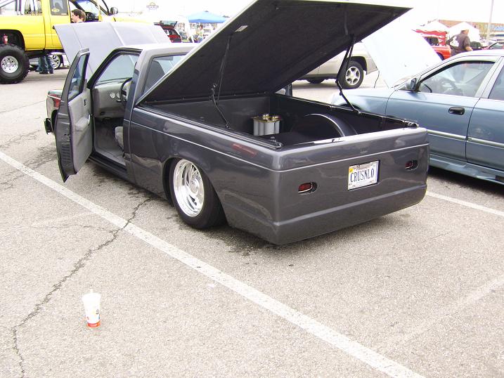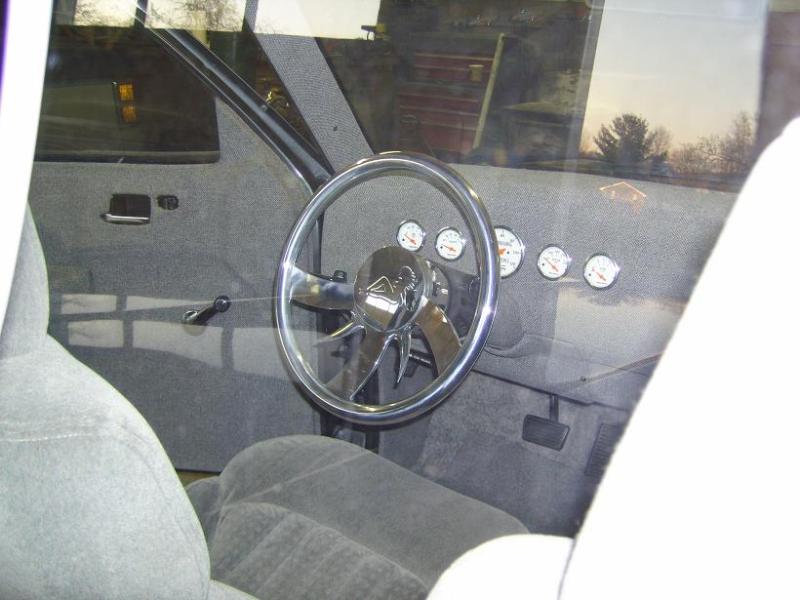 Fiberglassed dash with autometer gauges, head unit, LCD screen and DVD player. 99 S10 bucket seats, fiberglassed subwoofer box molded to back wall of cab.