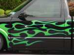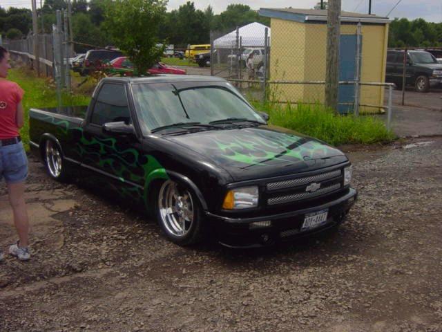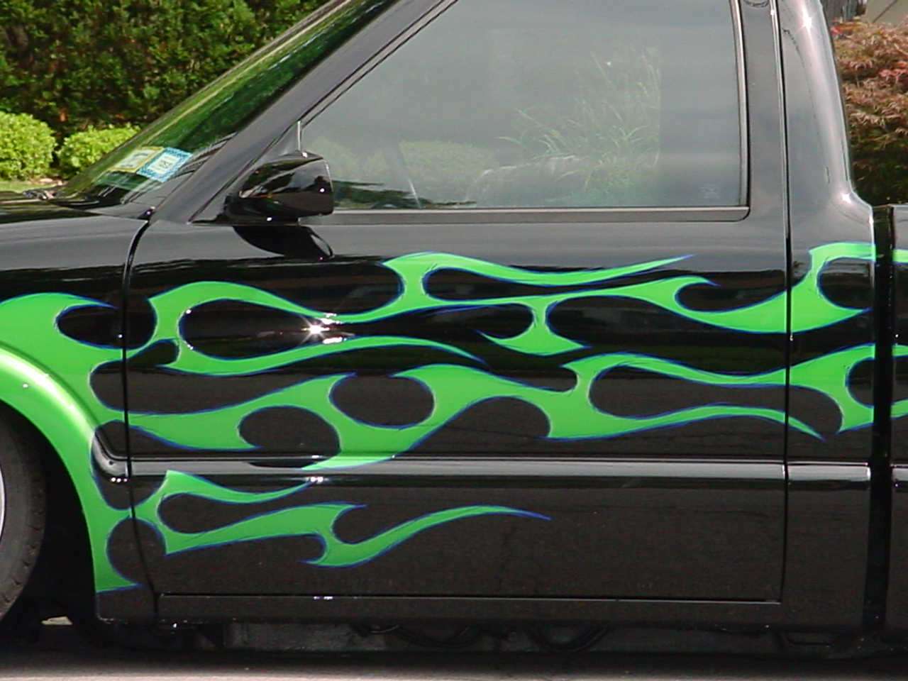 frenched front plate blazer grille speed grilles street scene mirrors flush bed cover shaved gate,handels,squirters,antenna,led third brake light, roll pan,lime time green tribal flames w/ blue slash stripes