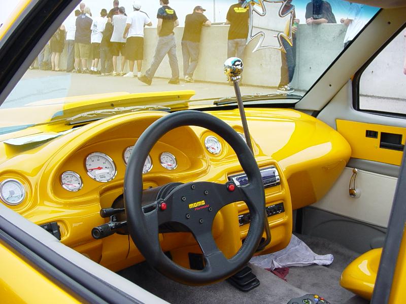 Custom fiberglass dash and seats moulded and painted to match the truck.