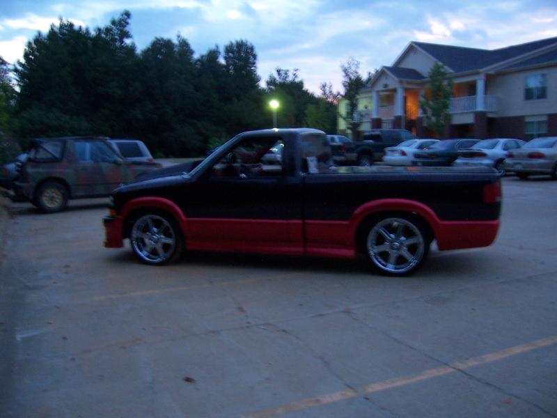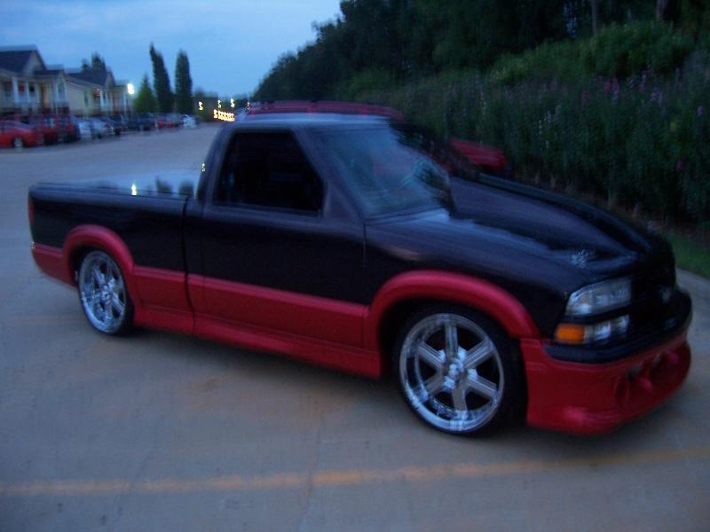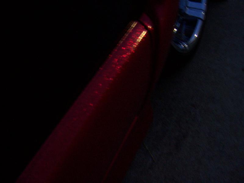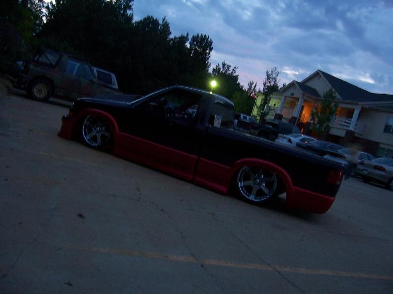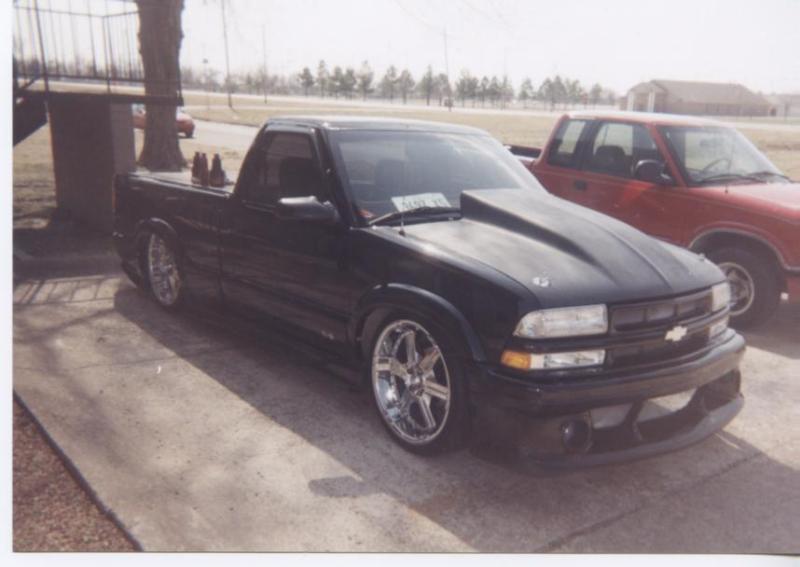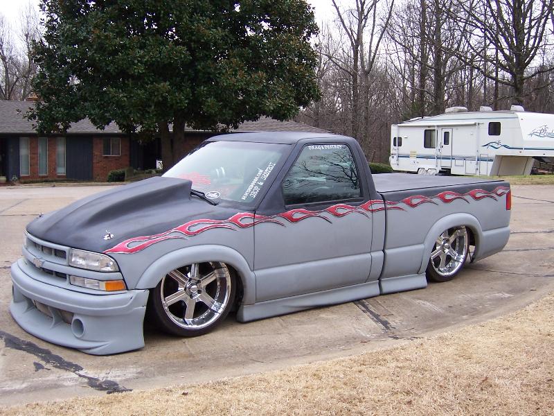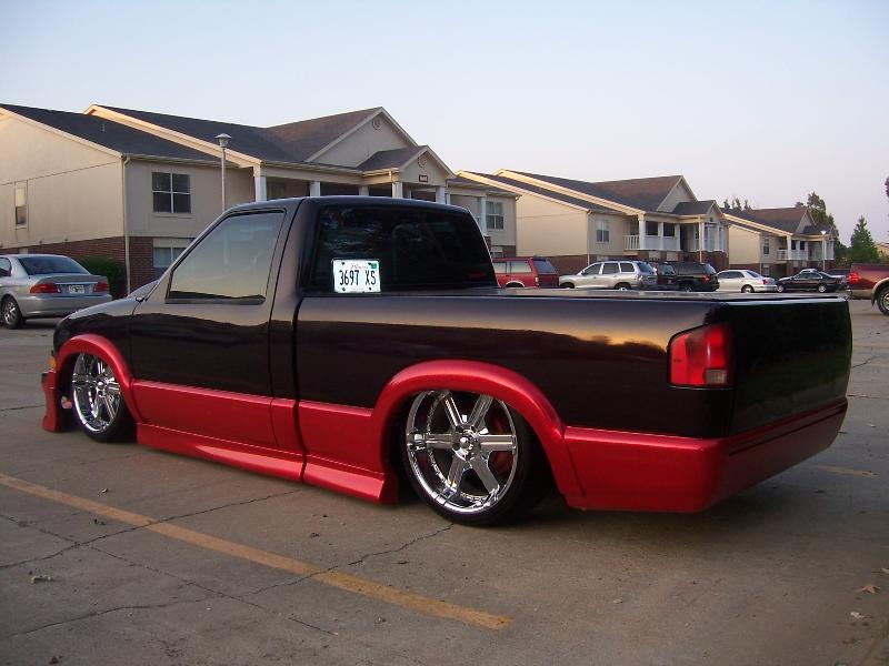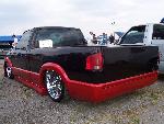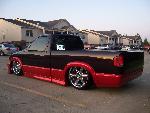 shaved mirors, door handles, squirters, fuel door, third brake light, antenna, tail gate handle, FBI rollpan, Zenon front bumper cover, UP22 4 3/4 cowl hood, smooth cowl, checker bed cover, PPG black lava red pearl on top, PPG flame red on the bottom with 6oz. of flame red Old School Flake*SOLD