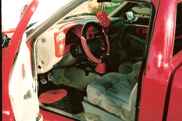 painted to match dash and speaker panels...flamed billet mirror...red shift knob..
