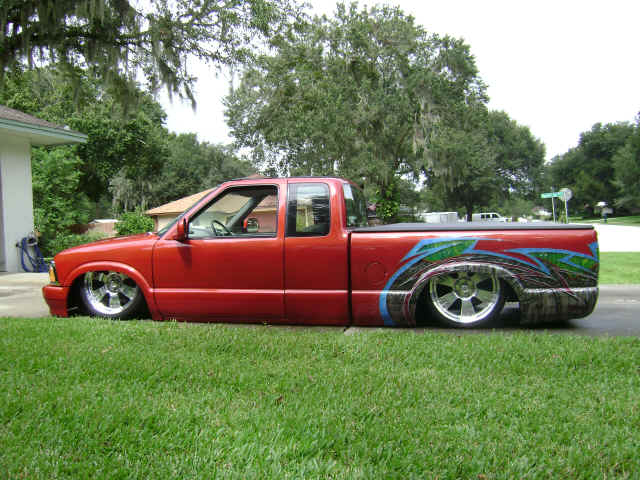 3 inch bodydrop ,shaved handles ,antenna ,hood squirters , tailights, and third brakelight, inside of bed smoothed out,96 blazer grill and headlight , 40 x 35 ragtop, along with a custom paint job