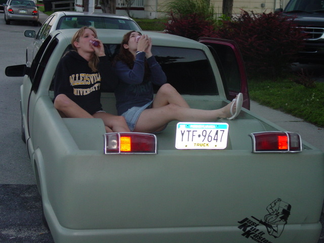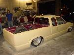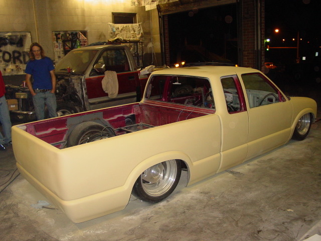 it's pink now,will be blue on bottom, think a silver color on top, and tribal spliten the 2 tone. but we got doors and front end riped apart. shaven door handles, 3rd brake, antana, washer things, rollpan, tailgate, frenched li plate, silverado tail lights