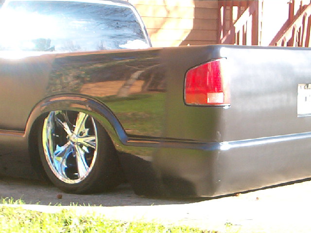 BLACK WITH 50% PRIMER, FULLY SHAVED: ANTENNA, WIPER PISSERS, DOORS TWICE, 3RD BRAKE LIGHT, EXT. CAB LINES, GAS DOOR, FULL CALI SKIN COMBO, WITH LINCENSE BOX IN CENTER OF TAILGATE, STOCK TAILLIGHTS. 95 BLAZER CONVERSION FRONT END, CUSTOM CLEARED CORNERS IN COMPOSITE HEADLIGHTS, CHROME SPEED GRILLE INSERTS, 2ND GENERATION 2" COWL, TINTED WONDOWS, 18'S, BAGGED