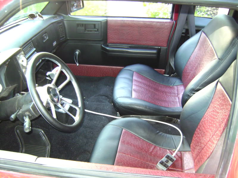 New headliner and carpet, dyed dash, door panels dyed and wrapped in ostrich. Cavalier buckets covered in pleather and ostrich, bolted to the floor.