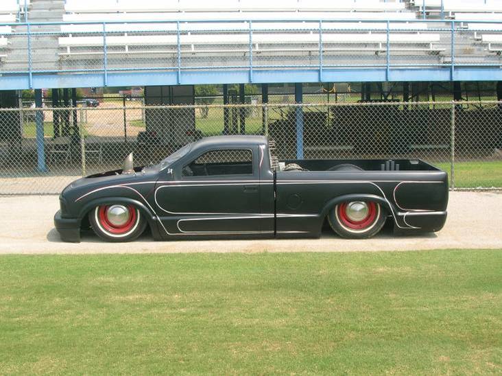flat black with white scallops 8 inchs out of top 5 1/2 bodydrop 1949 ford windshield, hand fabbed frame and cowl, 1991 full size chevy truck roof, uni tub inside bed, smoothed with louvers on the sides, pinstripes on dash, roof, tailgate, front bumper,cowl, and hood, one off grille and rear roll pan, tailgate shaved as was the taillights, mirrors, antenna