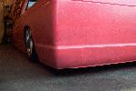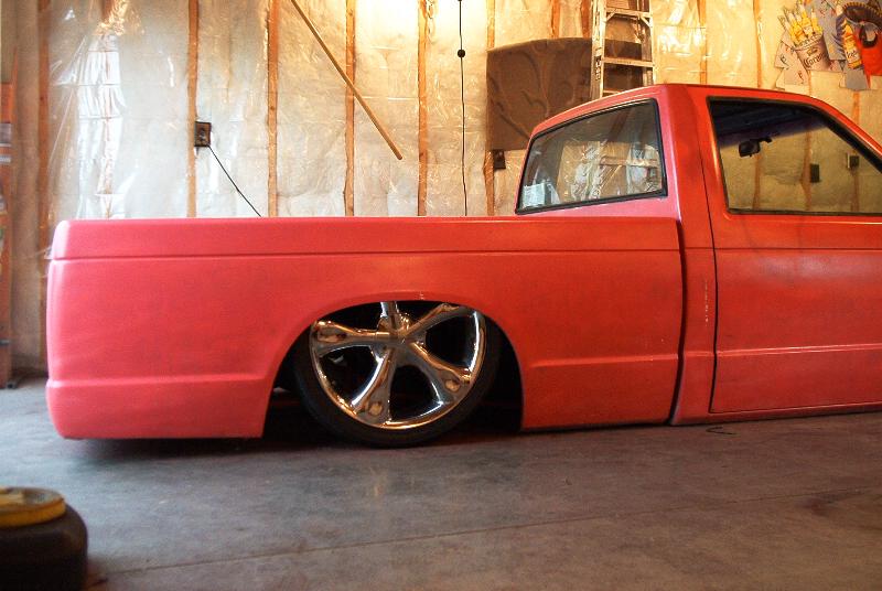 pink primer, shaved, bodydropped 4 1/2, suicide doors, tubbed with matching bed lines notch cover, crooked front plate in bumper