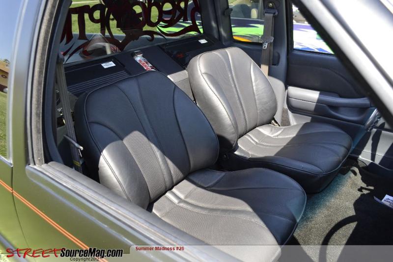 chopped cavalier buckets wrapped w/ perforated leather & black vinyl, new black carpent, black headliner, new speaker box wrapped in black vinyl as well, dyed all interior plastic 1998 chevy dark grey w/ dupont vinyl dye, KAIK door cups, TRENZ billet shifter and steering wheel, billet & acrylic fantasies; o shit handle, speaker grilles, defrost grilles.