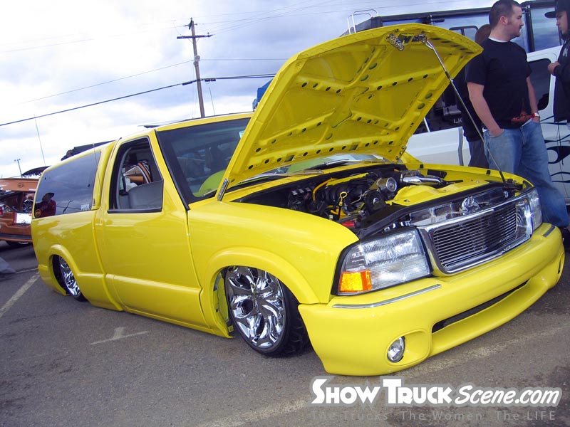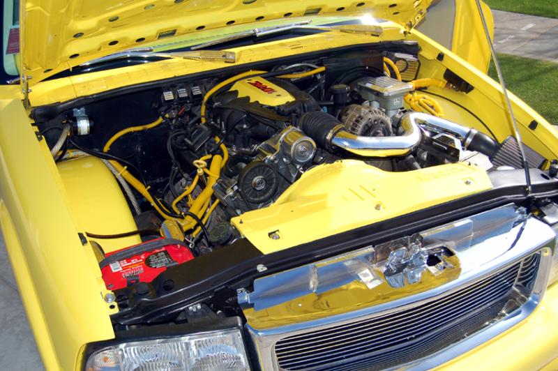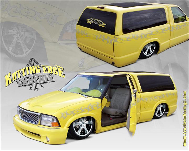 Lemon ice Yellow, Fully Shaved, Envoy front.. 35 ford tails. Suicided Doors, Leer campershell,power rap top on camper, billet grille,ram air hood, pin striping from jay werner