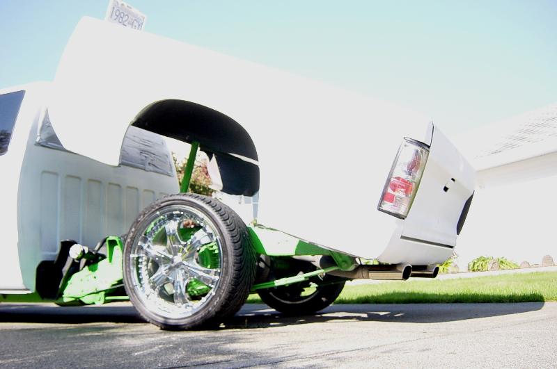 white primer...shaved body line,wipper cowl ducts,cab seems,gas cap, tailgate- dump truck bed lift up- cutlass mirrors,roll pan,frame painted gabber green,phantom grille, 92 toyota bumper with clear corner lights, euro tail lights, window tint,