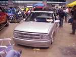 body drop with full tube frame, dupont silver arrow met paint. shaved ass end, with l.e.d's and plate frenched in back window, welded shut bed cover with gas door relocated in as well, shaved door handles and antenna, all body lines in cab including third break light, 1997 blazer headlights, and air tank in the bed.