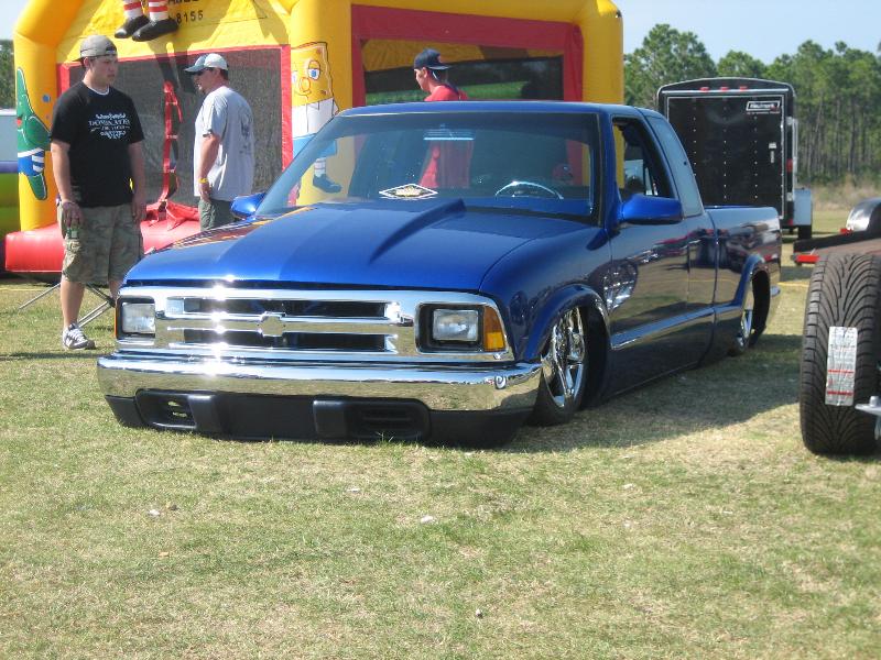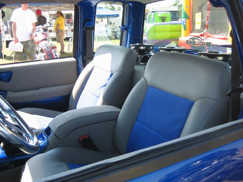 trad. b/d 3 1/2, cowl hood, shaved wiper cowl, door handles, third brake, gas door, sheet metal bed with radiused corners, frenched tag, motorcycle pop-up gas cap, custom trucker lady taillights, street scene mirrors, 98 bumper & valence. All work done by Mike @ Endless Fab. in Dallas, GA. 678-758-2563. Paint is 350z blue. Special thanks to Al & Jesse for the paint job.