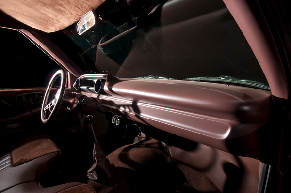 63 Ford Galaxy Dash w/ Dakota Digital Gauges. Chopped factory s10 bench and smoothed everything. Billet Specialties Steering wheel/window cranks. All interior covered in chocolate leather/suede/paint and daytona weave carpet. Gennie Shifter knob on custom shifter. *www.friendlychopshop.com* and Hudsons Hot Rod Interiors.