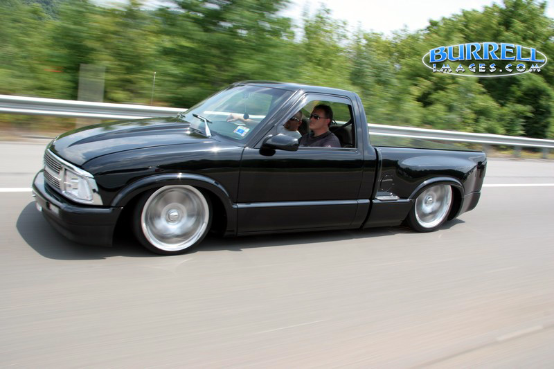 97 Blazer grille, grille inserts, 97 Blazer euro diamond clear headlights, cowl induction hood, smooth wiper cowl, billet wiper arms, street scene mirrors, shaved door handles, checkmate bed cover skinned with black powdercoated sheet metal, billet step plates, shaved and relocated tailgate handle and shaved rear steps, smoked third brake light and GTS tailight covers.